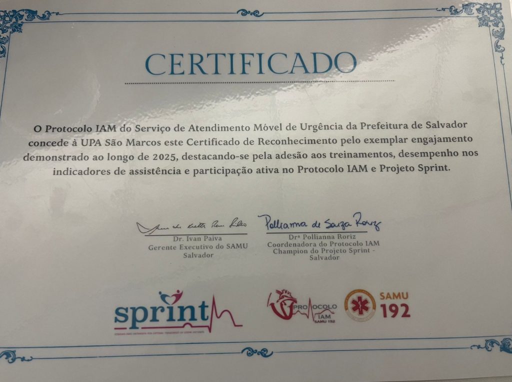 O reconhecimento também reforça a importância do Protocolo IAM do SAMU Salvador, que atua de forma integrada com as unidades de saúde para garantir atendimento rápido, padronizado e baseado em evidências científicas aos pacientes com suspeita de infarto, fortalecendo a rede de urgência e emergência da capital.