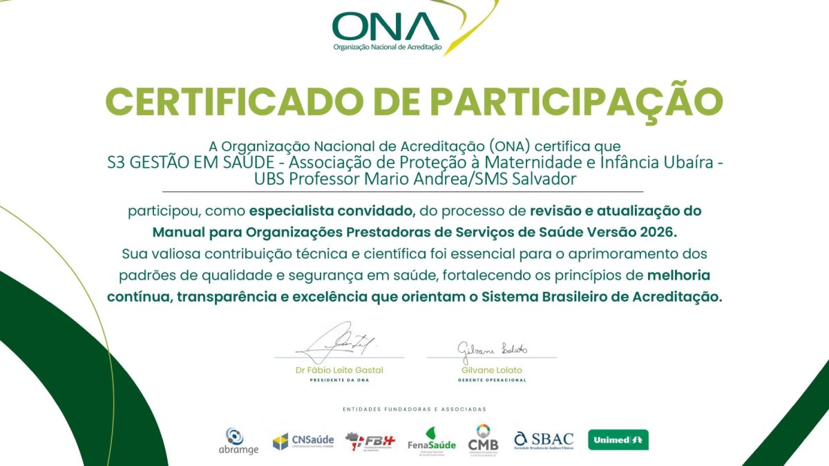 A S3 Gestão em Saúde recebeu da Organização Nacional de Acreditação (ONA) o Certificados de Participação como especialista convidada no processo de revisão e atualização do Manual para Organizações Prestadoras de Serviços de Saúde – versão 2026. Ao todo, a instituição foi agraciada com 05 certificados. O reconhecimento destaca a contribuição técnica e científica da instituição baiana para o aprimoramento dos padrões nacionais de qualidade, segurança e gestão em saúde.